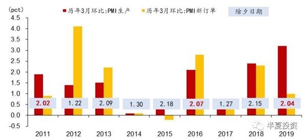 2,但上面说到的终端需求的改善,并不是最主要的驱动,如果我们看PMI的分项数据,就会发现,今年三月的回升,新订单的回暖跟之前几年比并不显著。下图来自华泰证券固收组。