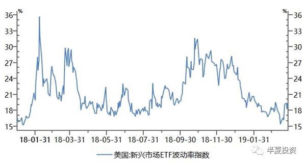 金融领域我们看到VIX回到去年10月风险资产下跌前的水平,新兴市场的隐含波动率甚至低于去年年中。
