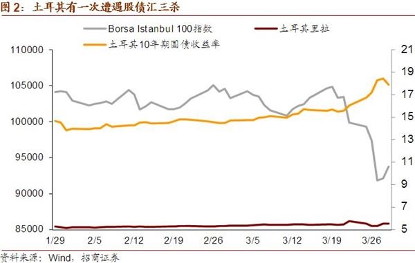 一系列事件引发了土耳其的资本市场动荡。3月22日,土耳其股债和里拉汇率开始出现大幅调整,土耳其里拉当日贬值5.2%,但在抬升后企稳回升;截至3月27日,Borsa Istanbul 100指数累计下跌了11.2%,截至3月28日,土耳其10年期国债收益率上升288BP至18.43%,显示高短端利率和高政治风险使得土耳其股债资产持续遭到抛售。