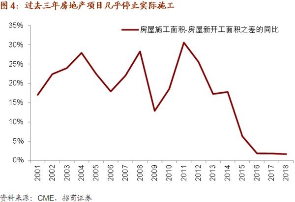 根据我们的测算,2001-2018年,施工面积-新开工面积之差的平均增速为17.5%,而2015年增速为6.3%,2016-2018年的增速为1.9%、1.8%和1.7%。这说明2015年至今房地产投资在项目建设上除了进行了地基处理或打永久桩之外,几乎停止了房屋施工。