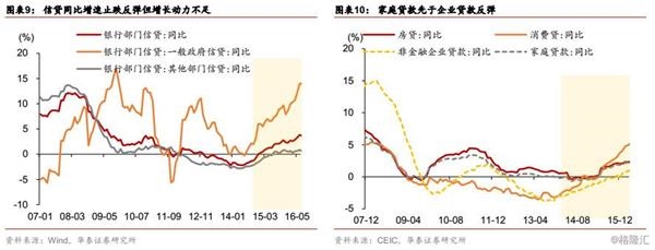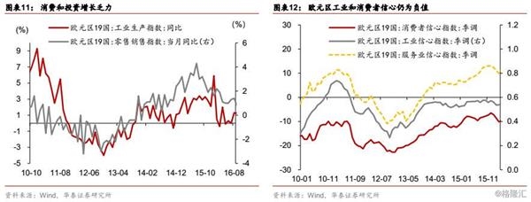 作为银行和实体部门流动性转移的重要渠道,信贷增速止跌反弹,但增长动力不足。银行部门信贷同比在2014年12月转为正向增长,2016年6月持续上升至3.8%。但其中非政府部门增长乏力,2016年6月同比增速仅为0.9%,政府部门信贷成为本轮信贷回升的主要力量,同比增速一度超过10%,央行释放的流动性流入实体部门数量有限。同时,家庭和企业部门的恢复程度也出现分化。截至2016年3月,家庭贷款同比增速率先进入正区间反弹至2.2%,且消费贷相对房贷增速更快;企业贷款也回升至0.9%,但相比07年危机前15%的高增速还存在很大距离。负利率无法提振企业的融资需求,导致消费和投资增速有限,且和工业信心指数自欧债危机后一直位于零水平以下,消费和投资后续支撑力不足,流动性脱虚入实的效果不尽如人意。