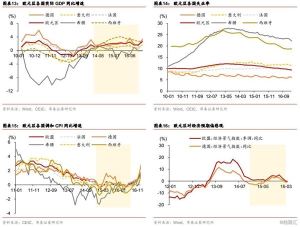 整体来看,负利率政策在欧元区经济恢复上起到了些许作用。负利率维持两年后2016年二季度实际GDP增速才缓慢爬升至2.5%,且欧元区内部各国恢复情况也存在差异。德国经济复苏进度相对较好,失业率持续走低,实际GDP同比抬升较快,但其他国家如希腊、西班牙等受银行坏账、政治困局、经济结构等问题的困扰,失业率居高难下,经济增长滞缓,难言已从困境中脱身。