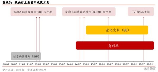 受2008年金融危机和2009年开始的欧债危机两轮冲击影响,欧央行试图通过多种货币政策工具来刺激经济增长。2008年8月起,连续大幅下调基准利率,主要再融资利率由4.25%下调至2009年5月的1.25%,但由于欧洲主权债务危机持续发酵,欧洲经济并未好转,且通胀持续下行,进入通缩时期。2010年5月-2012年8月,欧央行实施证券购买计划(SMP),大量持有欧元债券以释放流动性。同时,为刺激银行发放信贷,缓解融资难的困境,欧央行分别于11年12月和12年2月开展两轮三年期的长期再融资操作(LTRO),规模超过1万亿欧元,利率仅为1%。