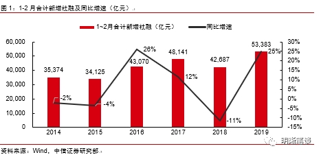 2019年1-2月社融超量回升。2019年1月新增社融4.64万亿,创历史新高,同比多增1.56万亿,但2月由于春节错位以及票据融资趋严,新增社融仅7030亿元,同比少增2559亿元。过滤春假因素的影响,将前两个月社融数据结合起来看,则2019年1-2月新增社融5.34万亿,同比增长25%,显著高于全年社融同比增速。