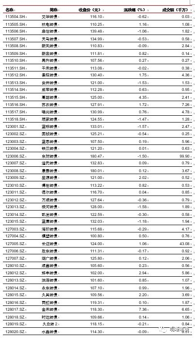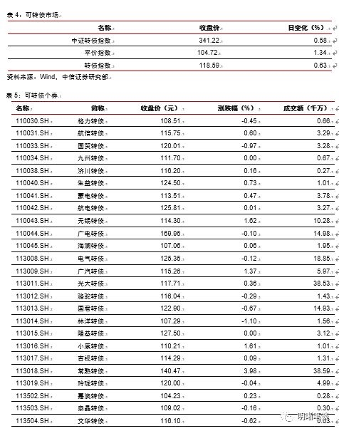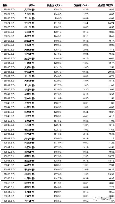 4月4日转债市场,平价指数收于104.72点,上涨1.34%,转债指数收于118.59点,上涨0.63%。138支上市可交易转债,除隆基转债、九州转债横盘外,86支上涨,50支下跌。其中伊力转债(30.57%)、中鼎转2(21.70%)、金龙转债(10.33%)领涨,视源转债(-2.65%)、利欧转债(-1.97%)、横河转债(-1.58%)领跌。138支可转债正股,除天马科技、上海电气、威帝股份横盘外,70支上涨,65支下跌。其中,辉丰股份(10.16%)、金新龙(10.04%)、久其软件(10.04%)领涨,顾家家居(-4.21%)、安井食品(-3.94%)、绝味食品(-3.56%)领跌。