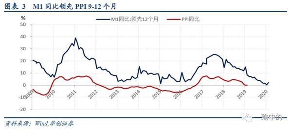 从历史数据来看,M1增速领先PPI同比变化近9-12个月。由于M1领先于企业库存周期变化,其也反映工业品的供需变化,M1上行表明企业投资意愿增强,需求增加带动工业品价格上行。