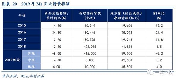 从模拟结果来看,2012年之前,商品房销售额的走势基本完全指引了M1的动向,经济周期的“地产”特征明显,2012年开始随着非标的发展,作为额外的投资渠道,非标的变化反应了企业的投融资需求,与M1有较高相关性。2015-2018年,在商品房销售额、非标贷款之外,地方债融资亦对M1产生较大影响,首先2014年底国家以降息搭配地产政策放松开启地产周期使得商品房销售的影响增强,其次,2015年地方债置换开启,加大了机关团体现金流波动。此外,在整个过程中,4年间货币政策经历了由宽松向紧缩的转变,非标贷款在高绝对值基础上大幅波动,对期间M1的变化起到决定性的影响,在模拟结果中的系数大幅提升。