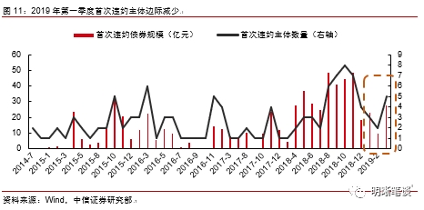 边际上的积极变化:新增违约主体正在减少,违约风险趋缓。从月度数据来看,2019年前三个月的首次违约主体数量和违约债券规模虽高于2018年同期水平,但明显低于2018年下半年水平,进一步印证了违约风险正在边际减少。由于低资质发行人已陆续违约出清,预计2019年全年的新增首次违约主体数量将明显低于2018年,违约风险趋缓是大概率事件。