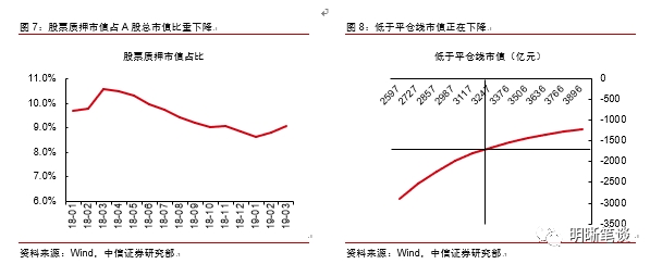 随着权益市场的回暖,股权质押风险正在缓解。2018年股市下跌导致的股权质押风险是压制民企信用修复的重要因素,尤其是下半年股票质押风险集中爆发,导致投资人对于民企的风险偏好一降再降。2018年10月开始,地方政府、监管层、券商、保险等纷纷加入化解上市公司股票质押风险的纾困行动中,民营上市公司的股权质押危机开始缓解。从场内外数据加总来看,A股股票质押市值占总市值比重由2018年高点的10.6%降至9.1%。外加近期股市的回暖,我们测算出低于平仓线的市值目前为1665亿元,较年初下降超1300亿元,若股值继续上涨,则整体上强平风险将进一步缓解。