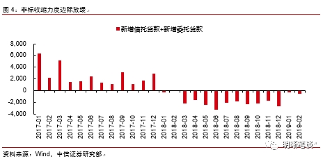 非标收缩力度边际放缓。从新增信托贷款和委托贷款的数据来看,2019年1-2月的非标融资合计收缩900亿元,低于2018年3月以来的任一单月水平,非标融资的收缩力度出现了边际放缓的趋势。央行行长易纲在2018年12月曾表示,“影子银行是必要补充,但要规范经营”,预计后续非标融资将保持微量收缩的状态,不排除年内出现拐点,对社融的负面影响也逐渐消散。