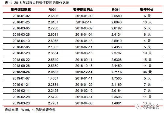 近年来逆回购成为央行对市场流动性进行精细调整的主要工具之一,2018年以来央行曾多次连续数月暂停逆回购操作,且一般暂停时间处于月初流动性较为宽松的阶段。2018年以来央行共有15次暂停逆回购操作的记录,其中有7次10天以上暂停逆回购操作。2018年10月26日至2018年12月14日,曾出现过央行长达36天没有进行逆回购操作的情况,创2016年以来最长连停记录,而与此同时11月初SHIBOR隔夜利率、DR001和DR007都出现了上升趋势,市场表现出较为紧张的担忧情绪。最近一次,央行自2019年3月末开始已经连续13天未进行公开市场逆回购操作,资金利率却不断下降,目前已经降至2019年来的最低水平附近。