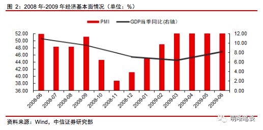 2008年受美国次贷危机影响,我国推行四万亿政策强力刺激经济和促进投资。2008年12月至2009年9月,隔夜利率持续低于1.5%,尤其在2009年上半年,隔夜利率持续低于1%。基本面方面,从2018年10月开始连续5个月低于荣枯线,同时增度也逐渐走弱。主要受到美国次贷危机影响,外需大幅走弱,由于我国经济一直存在“储蓄过高、消费不足”的问题,过剩的产能只能通过内需消化,因而央行推出“四万亿”政策刺激基建投资以期重振经济。同时货币政策处于宽松周期,从9月15日起,央行4次降准、5次降息,并下调公积金利率、准备将存款、流动性在贷款和再贴现利率。