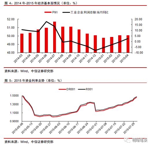 2015年长时间实行宽松的货币政策政策。2015年5月至7月,隔夜利率持续低于1.5%。一方面,2014年我国经济走向下行通道,2014年8月起工业企业利润增速为负,且PMI也呈现下降趋势。另一方面,为缓解企业“融资难、融资贵”问题,故2015年继续延续2014年的货币宽松政策,央行通过SLF操作、定向降准、降低基准利率等方式不断向货币市场输送流动性,并于2015年2月、4月、9月和10月进行了四次普遍降准,并先后9次下调公开市场逆回购操作利率,货币宽松政策持续时间较长且力度较大。同时,2015年施行宽松的信贷政策,下调住房公积金贷款利率并推进棚改货币化措施,投资企稳回升。