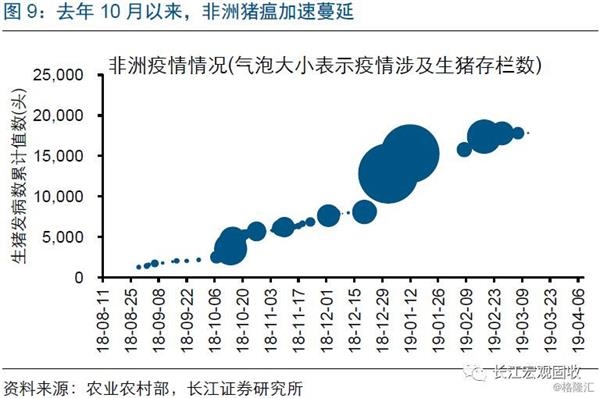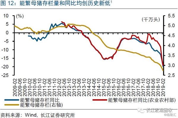 非洲猪瘟加速扩散下,生猪去产能程度超过以往周期,或对猪价上涨形成持续支撑。自去年8月非洲猪瘟疫情在我国首次出现,疫情已扩散至全国29个省市。非洲猪瘟蔓延过程中,养殖户一度恐慌性抛售,导致当地猪价快速下跌,拖累养殖利润,加快去产能。2月农业农村部口径下的能繁母猪存栏量同比降幅达19.1%、为历史最大,降幅历史次大值为2015年2月的15.5%;考虑到春节后非洲猪瘟疫情有所加快,养殖户补栏情况偏弱,产能去化或还在延续。(详细分析请参考《猪价上涨,对CPI影响测算》)。