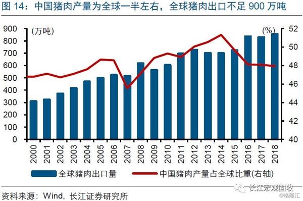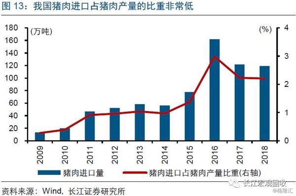 同时,猪肉进口规模非常有限,不足以对冲产能去化引发的生猪供给收缩。我国猪肉主要以自产自销为主,猪肉年进口规模最高也只有162万吨、占国内猪肉产量比重不到4%。我国是世界最大的生产国和消费国,猪肉产量接近全球的一半左右;即使将全球贸易猪肉全部进口到国内,也不足900万吨,与年均5500万吨左右的消费规模相去甚远。因此,不论是从生产还是消费端来看,猪肉进口对国内猪价的影响都非常有限。