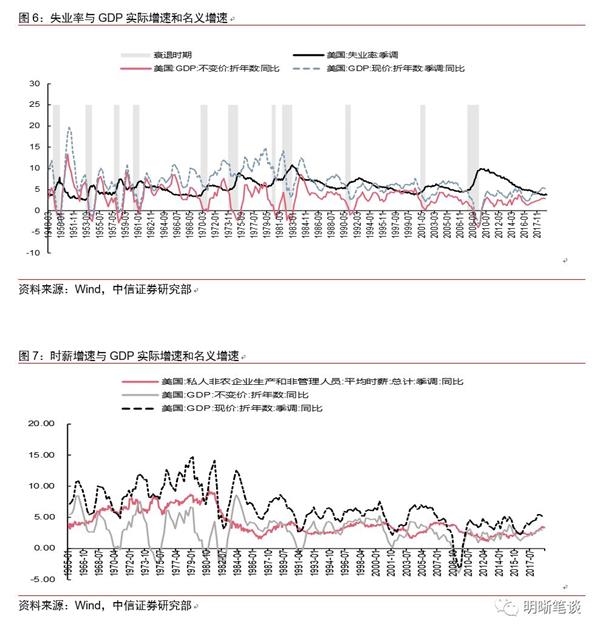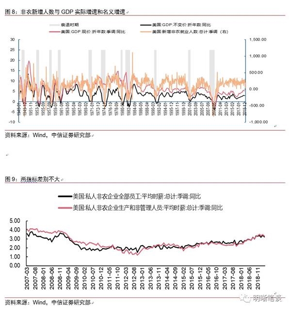 就业数据往往是经济的滞后指标,因此在经济放缓初期就业数据经常仍然表现强劲。下面几个图描述了失业率、时薪增速和非农新增人口数与增速之间的关系。可以看出在我们根据NBER的US Business Cycle Expansion and Contractions对美国经济周期的划分所认定的衰退时期到来之前几个月,失业率几乎都还在下降,甚至在衰退周期的初期,失业率有时也在下降,比如在1960年的3月-5月,失业率从5.4%下降到了5.1%、在1980年的1月-3月,失业率一直维持在6.3%不变,在2007年12月-2008年2月,失业率由5%下降到4.9%。时薪同比增速相对美国经济的滞后特征更为显著,1970年1月-3月,时薪增速同比由6.09%上升到6.35%、在1980年1月-4月时薪增速同比由7.00%上升到8.04%等,甚至在一些衰退周期,如1973年11月到1975年3月,时薪一直在上涨。尽管新增非农就业人数的数据看起来和经济周期十分同步,但它的波动性要比经济增速大很多,因此也很难作为对经济周期的评估标准。(注1:根据NBER的US Business Cycle Expansion and Contractions衰退周期为1948年11月-1949年10月、1953年7月-1954年5月、1957年8月-1958年4月、1960年4月-1961年2月、1969年12月-1970年11月、1973年11月-1975年3月、1980年1月-7月、1981年7月-1982年11月、1990年7月-1991年3月、2001年3月-11月、2007年12月-2019年6月。注2:这里的时薪数据我们选取的指标是“美国:私人非农企业生产和非管理人员:平均时薪:总计:季调:同比”。一般更常用的指标是“美国:私人非农企业全部员工:平均时薪:总计:季调:同比”,但这一指标从2006年才开始使用个,为了看更长的周期性变化,我们使用了替代指标。图4可以看出两指标差别不大。)