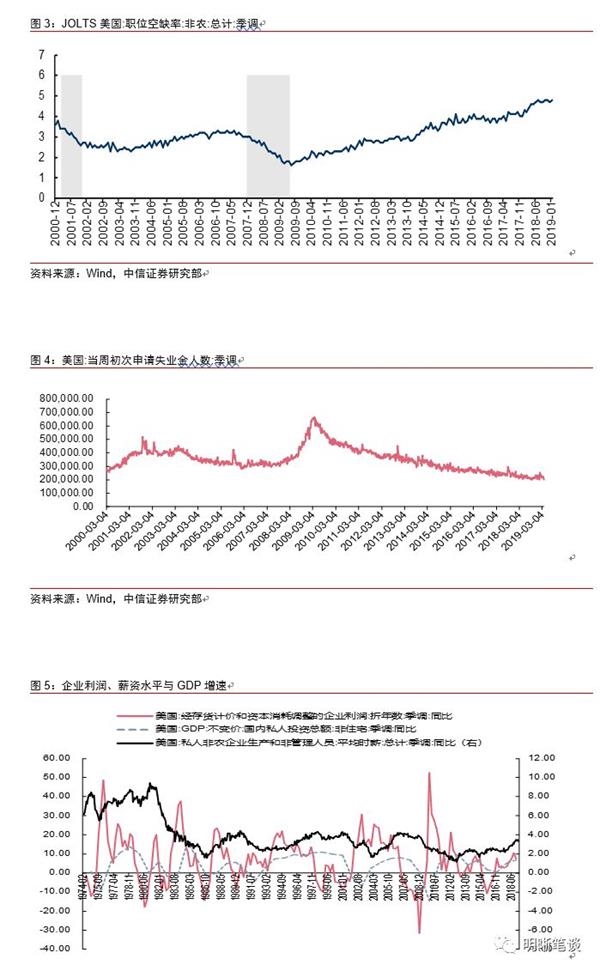 本轮美国经济周期的一个特征就是就业的复苏,比如前美联储主席耶伦就把就业做为政策的主要目标,一改以往货币政策盯住通胀的目标制,同时,美国总统特朗普也把就业增长做为主要的施政目标之一。但时至今日,我们看到在美国的各种数据出现放缓的时候,就业数据总体还是比较稳定,出现这种分歧的背后是什么原因呢?应该如何判断美国经济周期的走势呢?我们认为,就业数据往往是经济的滞后指标,因此在经济放缓初期就业数据经常仍然表现强劲。从充分就业的角度讲,经济在接近充分就业,就业市场的步伐正在逐步放慢。现在美国失业率已连续数月处于低位,薪资水平处于高位,新增就业人口数量乏力,美国经济可能实际已经见顶。