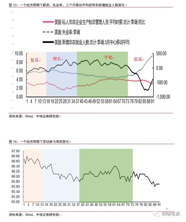 以一个经济周期为例(2001年12月-2009年6月),在经济复苏阶段,非农就业人口增长平缓,失业率、时薪基本维持不变,而劳动参与率在下降(这进一步说明劳动劳动参与率更多受长期趋势因素的影响而非经济周期影响);到了经济增长阶段,就业人数增速放快,失业率逐步下降,薪资水平先降后升;经济平稳阶段,就业人数在一定范围内波动,失业率继续下降直至底部维持不变,薪资水平逐步抬升后维持在高位;衰退阶段,就业人数大幅下降,失业率明显升高,薪资水平缓慢下滑。