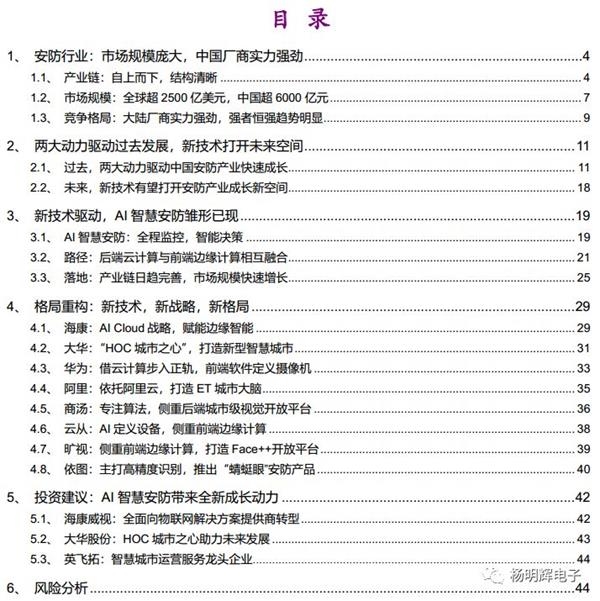 风险分析:贸易保护主义带来的不确定性风险;安防AI化不达预期,会降低公司产品ASP的提升速度,不利于公司业绩;经济增速下行,会给政府需求带来较大不利影响;新兴业务不确定性大,可能存在失败风险。