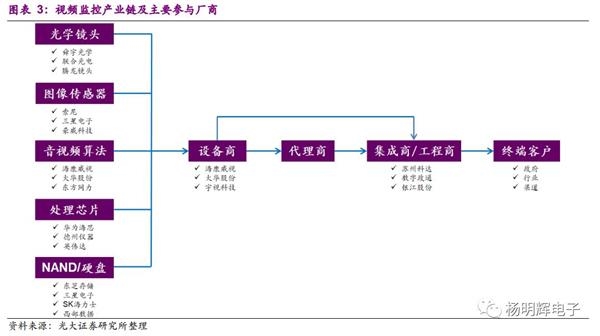 经过多年的发展,视频监控产业已经较为成熟,产业分工较为明确,已形成了一个自上而下、结构清晰的产业链。视频监控行业的上游主要包括光学镜头、图像传感器、音视频算法、处理芯片、存储芯片等供应商;中游环节是设备厂商;下游环节主要是代理商和集成商/工程商,它们负责最后的安防产品安装及测试;终端客户则分为政府、行业、渠道三个部分。