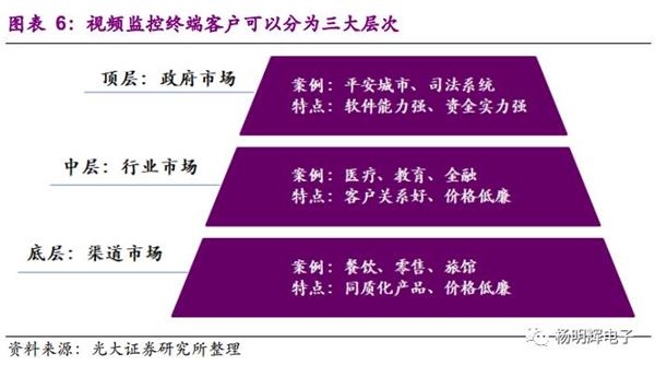 从终端客户来看,视频监控行业可以分为三个层次:顶层的政府市场、中层的行业市场和底层的渠道市场。
