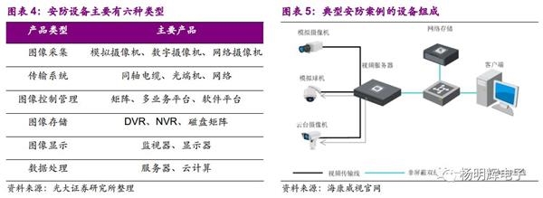 设备在视频监控产业中起着承上启下的作用。视频监控设备可以分为图像采集、传输系统、图像控制管理、图像存储、图像显示和数据处理六大部分,其中图像采集主要是各种类型的摄像机;传输系统包括同轴电缆、光端机、网络等;图像控制管理主要是软件平台;图像存储包括DVR、NVR等;图像显示包括各类监视器和显示器;数据处理则有服务器和云计算等方式。