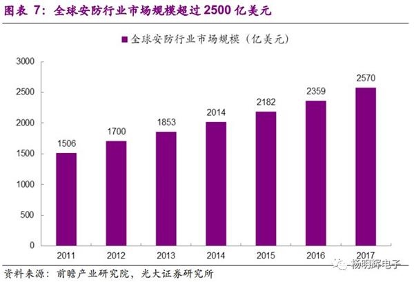安防作为社会的基础设施,在全球拥有庞大的市场规模。根据前瞻产业研究院的数据,2011年全球安防行业的市场规模达到了1506亿美元,在2014年突破2000亿美元,并在2017年达到了2570亿美元的市场规模。