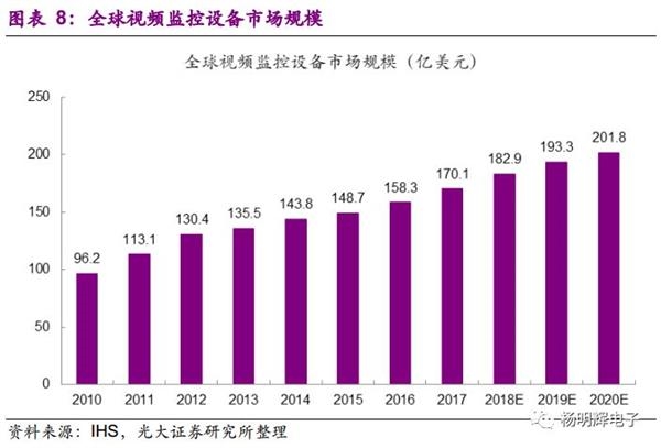 视频监控设备是安防设备中最重要的组成部分,在全球也拥有庞大的市场规模。根据IHS的数据,2017年全球视频监控市场规模达到170.1亿美元,并预计将在2020年达到201.8亿美元。由于IHS的统计样本主要包含大型厂商,并且对于视频监控设备的定义较为严格,所以我们认为全球视频监控设备的实际市场规模将更大。