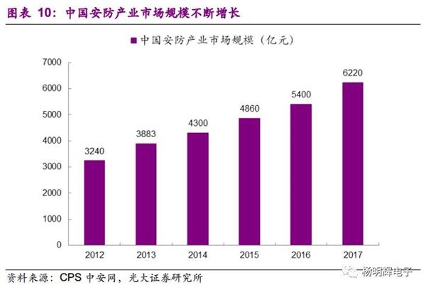 伴随着我国的城镇化进程,我国的安防产业市场规模也在不断扩大。根据CPS中安网的数据,我国安防产业的市场规模从2012年的2340亿元,增长至2017年的6220亿元,年均同比增长13.93%,保持着快速增长的势头。