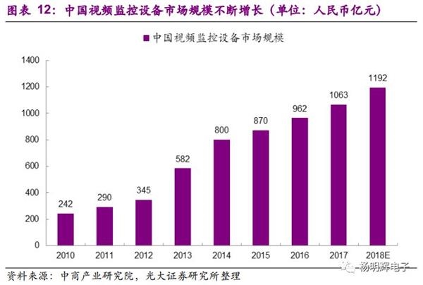 我国视频监控设备的市场规模也在不断扩大,根据中商产业研究院的数据,市场规模从2010年的242亿元增长至2017年的1063亿元,年均复合增速约为23.54%,保持着快速的增长势头。同时预计到2018年市场规模将达到1192亿元。