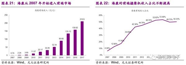 使用模拟摄像机成像的关键是更优良的硬件,这是松下、索尼、三星等海外安防厂商的优势;而使用数字摄像机成像的关键是算法的调校,这是海康威视、大华股份等中国安防厂商的优势。借助这次技术变革的机会,海康威视、大华股份等厂商开始从后端进入前端市场。从营收数据可以看出,海康从2007年开始进入前端市场,经过三年的投入,2010年收入开始快速增长。