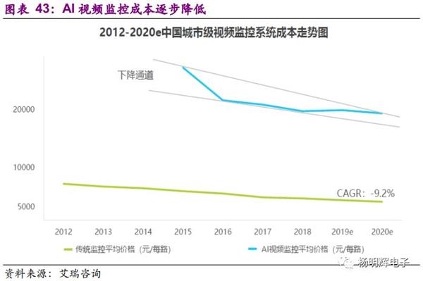 从产品价格来看,传统监控(包括模拟摄像机、高清摄像机等)的平均价格不断下降,2012年至2018年CAGR为-9.2%,而AI视频监控大部分出现于2015年,其价格走势也进入了下降通道,到2018年平均价格约为两万元,是传统安防摄像机的大约四倍。随着AI芯片价格的性能提升和价格下降,我们预计AI视频监控成本还有很大的下降空间。