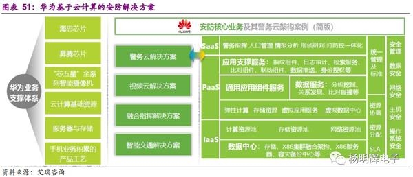 由于华为拥有ICT基础、云计算与芯片的优势,所以华为安防的新战略侧重在后端,试图用云计算的方式抢占市场。通过云计算的方式,华为可以较好地对安防行业进行全面设计,搭建资源整合、信息共享的业务架构,还能提供芯片、服务器、存储、摄像头等产品,支持软件平台。目前华为已经推出了警务云、视频云、政务云、金融云、教育云等多种基于云计算的行业解决方案。