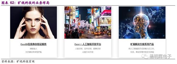 旷视科技主营业务包括Face ID在线身份验证服务、Face++人工智能开放平台、解决方案系列产品三大部分,其中解决方案系列产品包括端到端智能安防产品解决方案、行业物联解决方案、移动端AI解决方案、零售行业AI解决方案、智能仓储物流解决方案等。