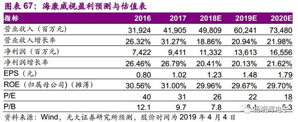 、估值与评级:我们认为海康威视在传统安防领域规模优势明显,并且深耕AI+安防解决方案,提出的“云边结合”理念推出的AI Cloud符合未来市场需求,并且已经在深圳等城市完成建设;在新兴业务领域,公司萤石云收入超过10亿,2C端市场空间巨大;在工业摄像机、AGV、物流仓储管理系统方面皆表现出众,具备工业4.0长期发展趋势。我们维持公司2018-2020年EPS为1.23/1.48/1.79元,维持“买入”评级。
