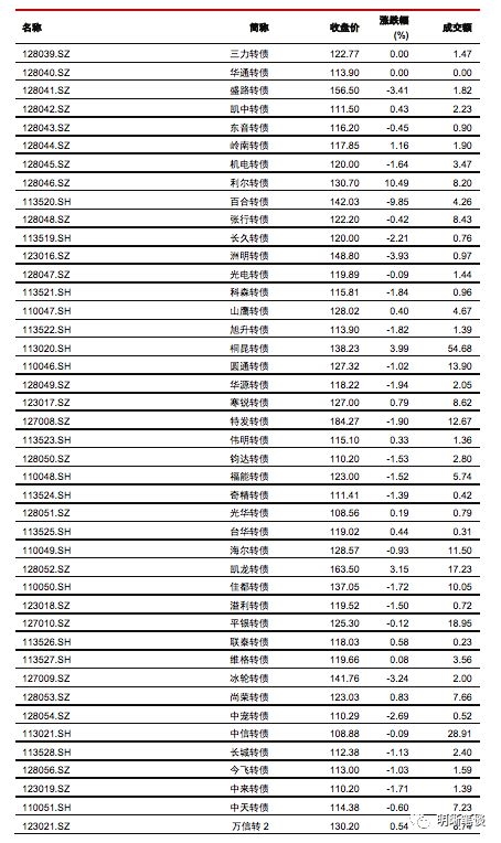 4月8日转债市场,中证转债指数收于340.02点,下降0.35%,平价指数收于104.94点,上涨0.24%,转债指数收于118.47点,下降0.09%。139支上市可交易转债,除华通转债、三力转债横盘外,46支上涨,93支下跌。其中富祥转债(20.79%)、金禾转债(19.21%)、长青转2(15.80%)领涨,百合转债(-9.85%)、鼎信转债(-4.97%)、蓝盾转债(-4.56%)领跌。139支可转债正股,除华通医药、洪涛股份、三力士上海电气横盘外,49支上涨,90支下跌。其中,辉丰股份(10.12%)、长青股份(10.03%)、富祥股份(10.01%)领涨,梦百合(-9.99%)、鼎信通讯(-5.84%)、骆驼股份(-5.59%)领跌。