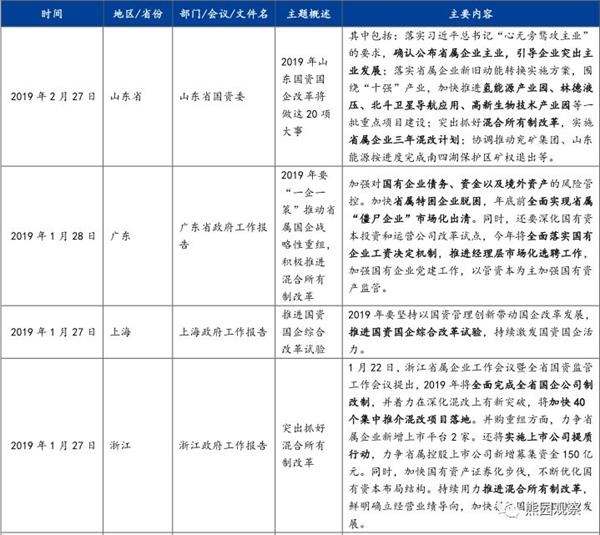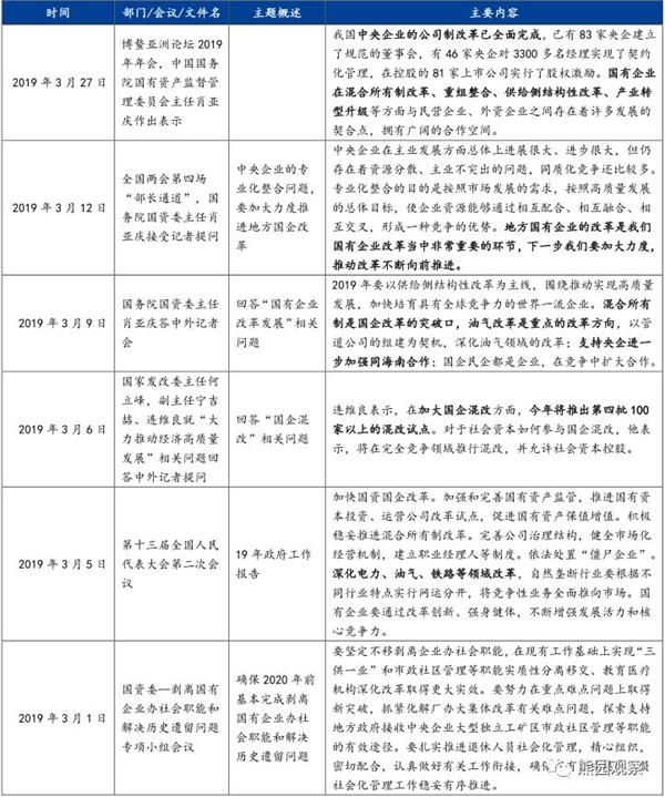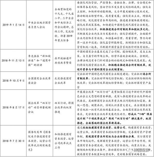 2、事实上,2018年二季度以来,国企改革已明显提速。统计发现,过去一年国家层面在不同场合以会议或文件等方式,共20多次对国改作出了部署(见附表),包括改革国有企业工资决定机制、开展国改“双百行动”、推出第四批100家以上混改试点等方面。其中,2018年底中央经济工作会议指出“强化竞争政策的基础性地位”;2019年政府工作报告则提出:加快国资国企改革(2018年是“推进国资国企改革”);自然垄断行业要根据不同行业特点实行网运分开,将竞争性业务全面推向市场。