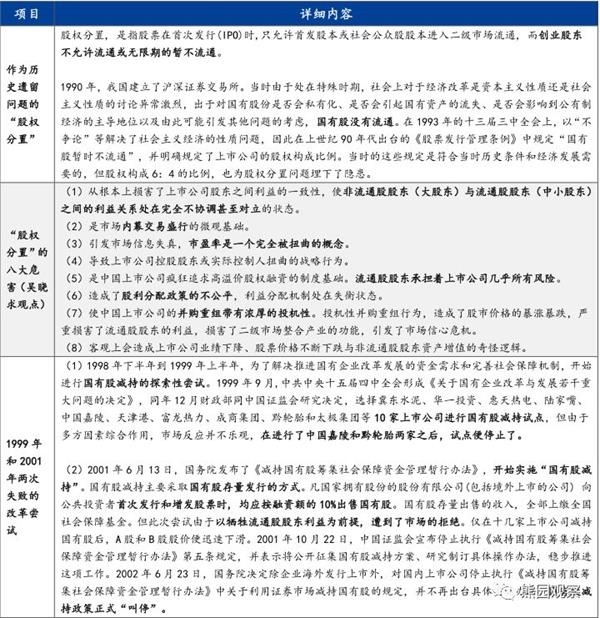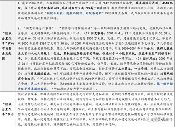 3、倾向于认为,本轮国企改革已拉开新帷幕,进展顺利的话,本轮国企改革有望比肩股权分置改革(2007年大牛市的主推手之一),很大可能会激发新一轮的制度红利。回顾看,国企改革贯穿了中国改革开放的整个历程,不同历史背景赋予其不同的改革目标与发展使命(大体分5个阶段,见附表)。应该说,基本上每轮国企改革都释放了巨大的制度红利,尤其是2005年前后全面推动的股权分置改革(见附表)。因此,格力本次混改如果最终成行,也有望推动本轮国企改革取得实质性突破,甚至比肩股权分置改革。