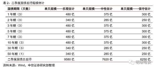 2019年3月29日,财政部发布了二季度国债发行计划,4、5、6月分别发行7、8、7只记账式附息国债,观察各期限国债自2015年开始每年二季度的发行金额分布可以发现,关键期限国债的发行金额基本在300亿至480亿的区间之内,2年期和超长期限国债的发行金额基本在250亿至340亿之间。可以基于此来简单估计乐观、中性、保守这三种情形下国债的发行规模。乐观情况下国债发行规模最大为9580亿,保守情况下国债发行规模最小为6250亿。