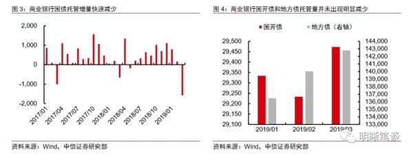 商业银行减少国债配置也导致国债收益率上行。从中债公布的托管数据来看,自2019年起,商业银行国债配置增量持续下行,而2019年3月,全国性商业银行托管量减少约1580亿,是自2007年以来的最大减少量,而与之对应的,全国性商业银行对国开债和地方债的托管量却并没有发生快速下行。截止至2019年3月,全国性商业银行国开债托管总量为29473亿,地方债托管量为142834亿,均高于年初水平。特别的,全国性商业银行3月地方债托管增量超过了2000亿,进一步验证了地方债对国债的挤出效应。