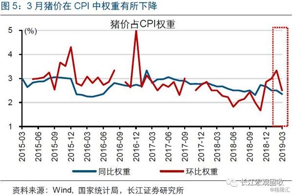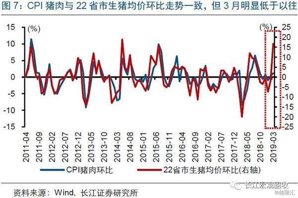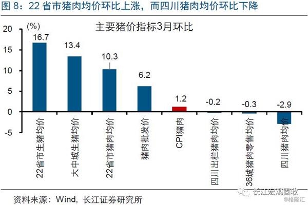猪价贡献不及预期,或与统计口径、猪价地区差异等有关。3月CPI同比上涨略低于预期,与猪肉贡献不及预期有关。一方面,可能与猪价权重变化有关,根据国家统计局的数据推算,3月猪价占CPI同比权重为2.35%、低于2月的2.5%[1],环比权重也有类似变化。另一方面,3月CPI猪肉变化幅度,明显低于22省市生猪均价等高频数据,高于过往CPI猪肉与高频数据的误差。一个可能的解释是,非洲猪瘟影响下,不同地区猪价变动差异较大,导致采样影响不同,例如,3月22省市猪肉均价环比大幅上涨、而四川猪肉均价环比下降。
