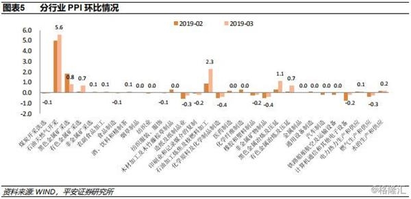 3月份PPI同比增速小幅上升0.3个百分点至0.4%,环比价格也结束四个月的连续下跌,由负转正。石油、对3月工业品价格支撑较大,其开采、石油冶炼、黑色金属冶炼业的环比增速分别为5.6%、2.3%、1.1%,较上月分别上升0.6、1.4、0.8个百分点。今年3月钢材价格的上升一方面有春节开工对现货价格带来了提振效应,另一方面,海外矿山产量收缩导致铁矿石进口价格上涨也带来了较大的推升作用。