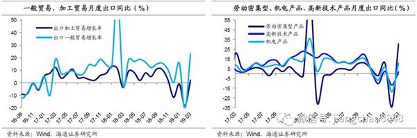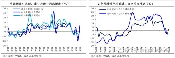 一、出口增速改善。3月我国以美元计价出口同比回升至14.2%(前值-20.7%)。由于外贸企业“春节前集中出口,节后进口先行,出口逐渐恢复”的特征,去年春节偏晚对去年3月出口拖累明显,出口基数偏低,而对进口影响较少,所以今年3月出口同比跳升。一季度整体看,我国1-3月出口累计同比增长1.4%,较18年12月增速略有上升,但不及18年全年累计增速,说明剔除春节扰动后,出口仅小幅改善。