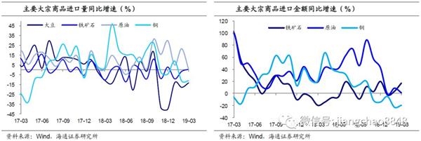 3月我国进口同比继续回落至-7.6%(前值-5.2%),印证3月需求依然偏弱。从数量看,3月我国进口大豆(-13.1%)、铁矿石(0.7%)、铜(-11.1%)和集成电路(-5.3%)同比增速较前月稳中略升,但进口原油(0.4%)增速大幅回落,是进口的主要拖累。从金额看,铁矿石价格同比上涨,进口铁矿石(17.5%)金额同比大幅回升,而进口原油(1.5%)增速回落。从累计增速看,1-3月进口金额同比-4.8%,延续了18年12月以来的负增。