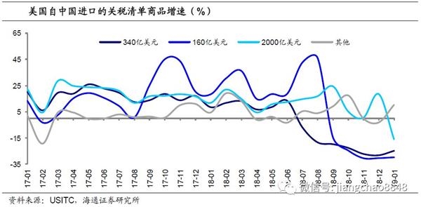 从对美国出口来看,我国对美出口依然偏弱。美国原定于今年1月1日将2000亿美元清单商品的关税税率由10%升至25%,因此去年12月出现了抢出口的现象,2000亿美元清单商品对美的出口同比大幅上升至18.7%。但去年12月G20会议之后,美国宣布将提升关税税率的日期推迟到19年3月,并在3月5日再度推迟加税。随着加税措施暂缓,2000亿美元清单商品的抢出口效应消退,出口增速回落,但之前加税25%的商品税率并未改变,340亿、160亿美元清单商品的同比增速依然低迷,维持在-30%左右。未来如果美国已加的关税暂不取消,那么加税商品的出口仍可能持续一段时间负增,叠加抢出口透支部分需求,上半年对美出口或仍偏弱。