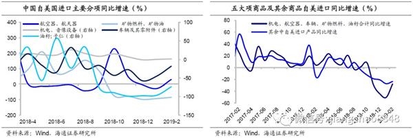 而从自美国进口来看,今年我国采取了扩大采购措施并降低部分关税,自美进口的大豆、飞机、汽车等主要产品同比跌幅收窄。18年12月G20会议期间,我国表示对美扩大农业、能源、工业等产品的采购,并自19年1月1日起暂停了对美国汽车及零部件的关税加征,因而1月起,我国自美国进口的大豆、汽车和飞机(分属HS分类下的油籽、车辆及其零件、航空器及航天器,这三大类约占自美进口总额的26%)同比跌幅明显收窄,同时,机电产品和石油的进口(两类合计占自美进口的31%)较去年也小幅改善,共同推动了我国自美国进口增速的回升。