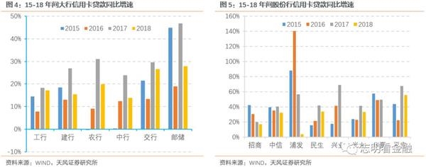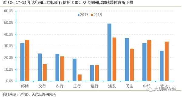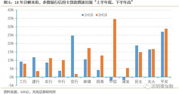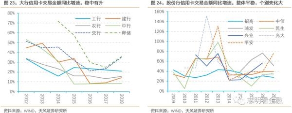 因基数较高,17-18年增速略有下滑,增量仍可观。12家已发布年报的大行和股份行合计来看,17年信用卡贷款的增量是10931亿;18年的增量是9990亿,同比仅少增941亿。分解来看,18年下半年增速整体好于上半年。交行18年26.6%的增速分拆到上半年和下半年分别为24.8%和1.8%,其实在下半年是显著收紧的。与之相反,中信18年全年的增速分解是-2.0%和34.6%,其实下半年放量更明显。类似的还有浦发,全年增速分解为上半年-1.7%和下半年5.3%,上半年的收缩有触底回升的意思。相当一部分银行的信用卡贷款增速出现“上半年低、下半年高”的状况,已披露年报的就包括农行、中行、邮储、招行、中信、浦发、平安,增长势头实质并未减弱,未来发展空间仍有待释放。