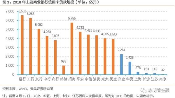 大行里,交行、邮储18年增速仍较高。单家银行来看,6家大行18年信用卡增速均低于17年,四大行均降至20%以下,但邮储、交行增速仍较高,分别为28%、27%。邮储信用卡贷款基数较小,18年末仅993亿,增长的绝对量为216亿;交行信用卡规模本身已较高,18H1在大行里列第三位,增加的绝对量就较大,达1062亿。