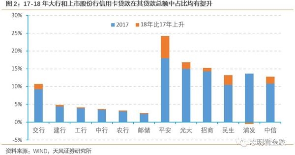 行业整体来看,信用卡在总贷款中占比稳步上升。总量来看,2018年底信用卡授信余额15.4万亿,应偿信贷余额为6.85万亿(以下简称“信用卡贷款”),在整体信贷中占比5.03%,环比仅上行7BP,17年同期是24BP,前值11BP。
