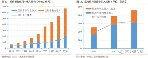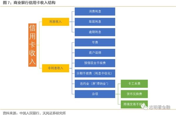信用卡业务收入由利息收入和非利息收入组成。利息收入主要是对信用卡贷款,按场景不同划分为消费利息、取现利息、逾期利息。一般情况下,信用卡利息收入统计在个贷利息收入中,不能区分,只有少数几家银行会披露。非利息收入包括年费、各类手续费、违约金等等,一般放在“净手续费及佣金收入”项下的“银行卡手续费”科目中。